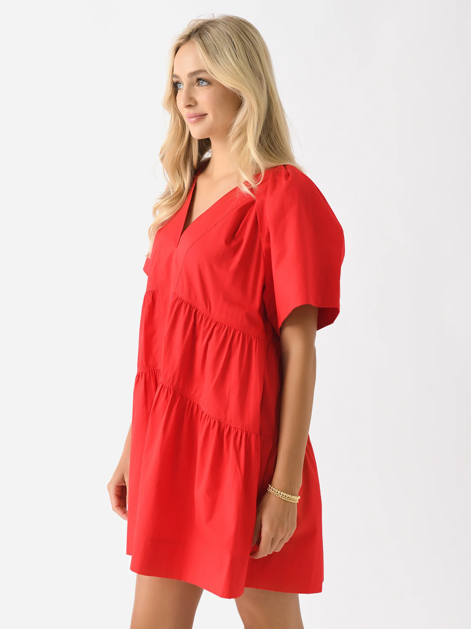 FEATURES:V-Neckline Side Pockets Tiered Seams Mini Silhouette 100% Cotton Twill Relaxed Fit Model is wearing size 4 dress. Model's Measurements: Height: 5'8" | Bust: 34C | Waist: 26" | Hips: 36.5" | Dress Size: 2 (US)