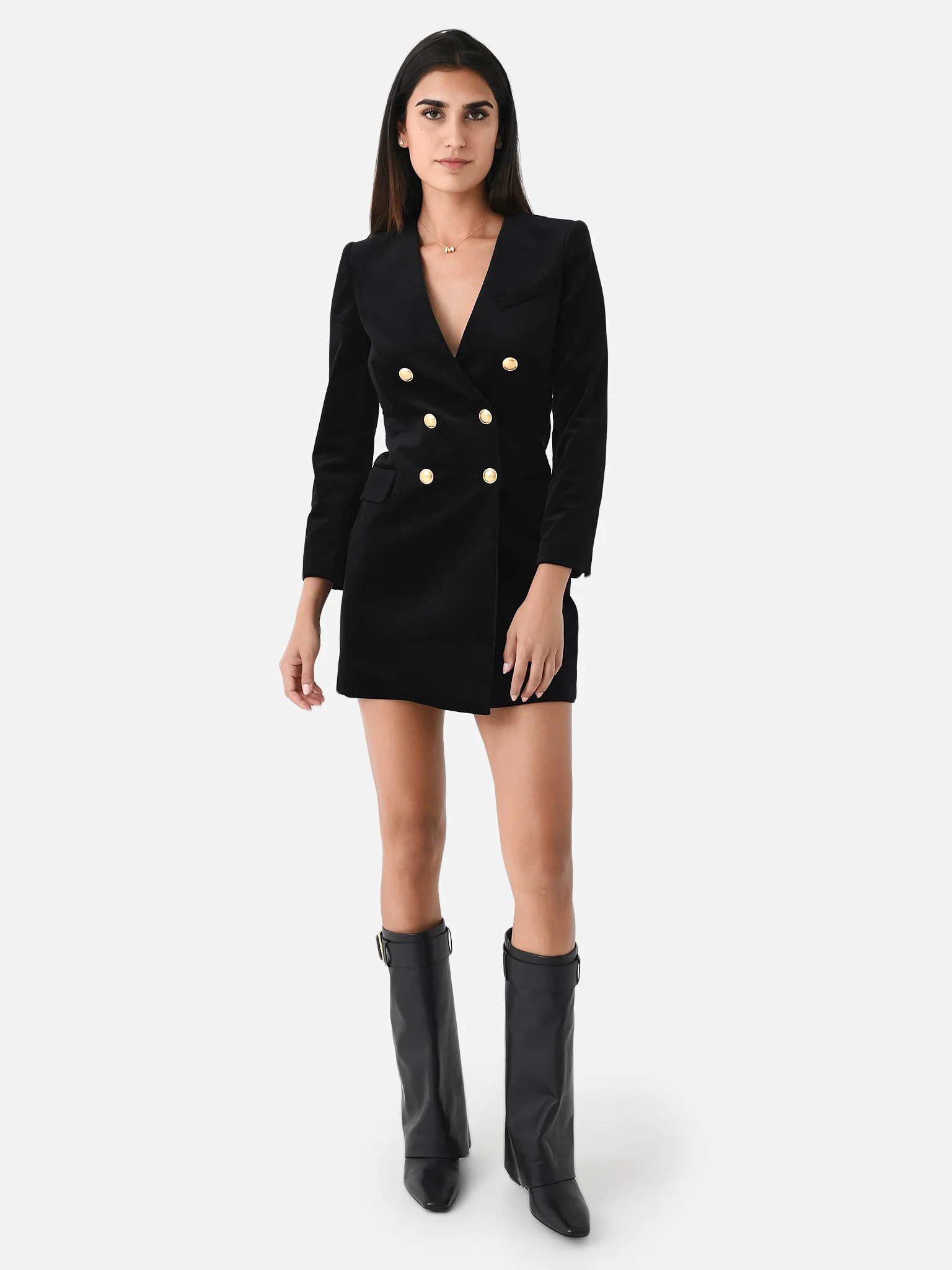 Velvet jacket-style mini dress featuring bracelet sleeves and a double-breasted front.