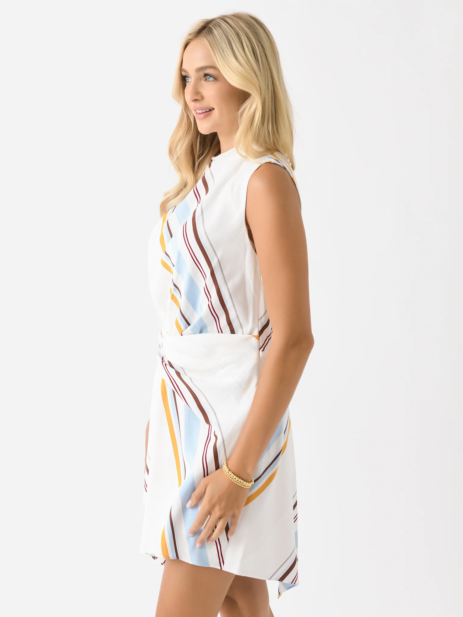 FEATURES:High Neckline Back Keyhole Button Closure Sleeveless Gathered Waist Asymmetrical Hem Mini Silhouette All-Over Stripe Print 89% Viscose, 11% Nylon Classic Fit Model is wearing size 4 dress. Model's Measurements: Height: 5'8" | Bust: 34C | Waist: 26" | Hips: 36.5" | Dress Size: 2 (US)