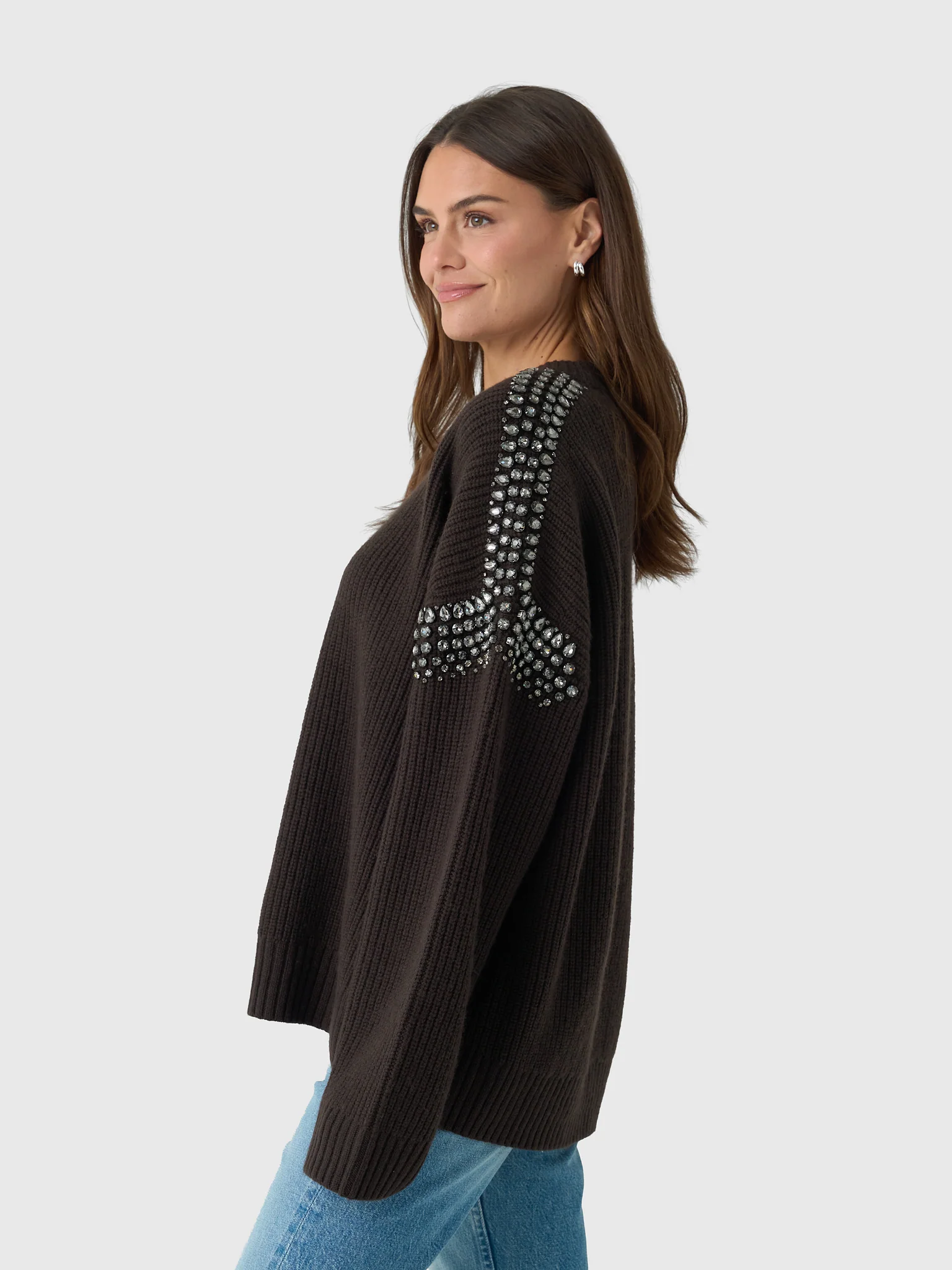 FEATURES:Crew Neckline Dropped Shoulder Crystal Embellishments Ribbed Knit Fabrication 100% Merino Wool Relaxed Fit Model is wearing size Small sweater. Model's Measurements: Height: 5'10" | Bust: 34B | Waist: 25" | Hips: 35" | Dress Size: 2 (US)