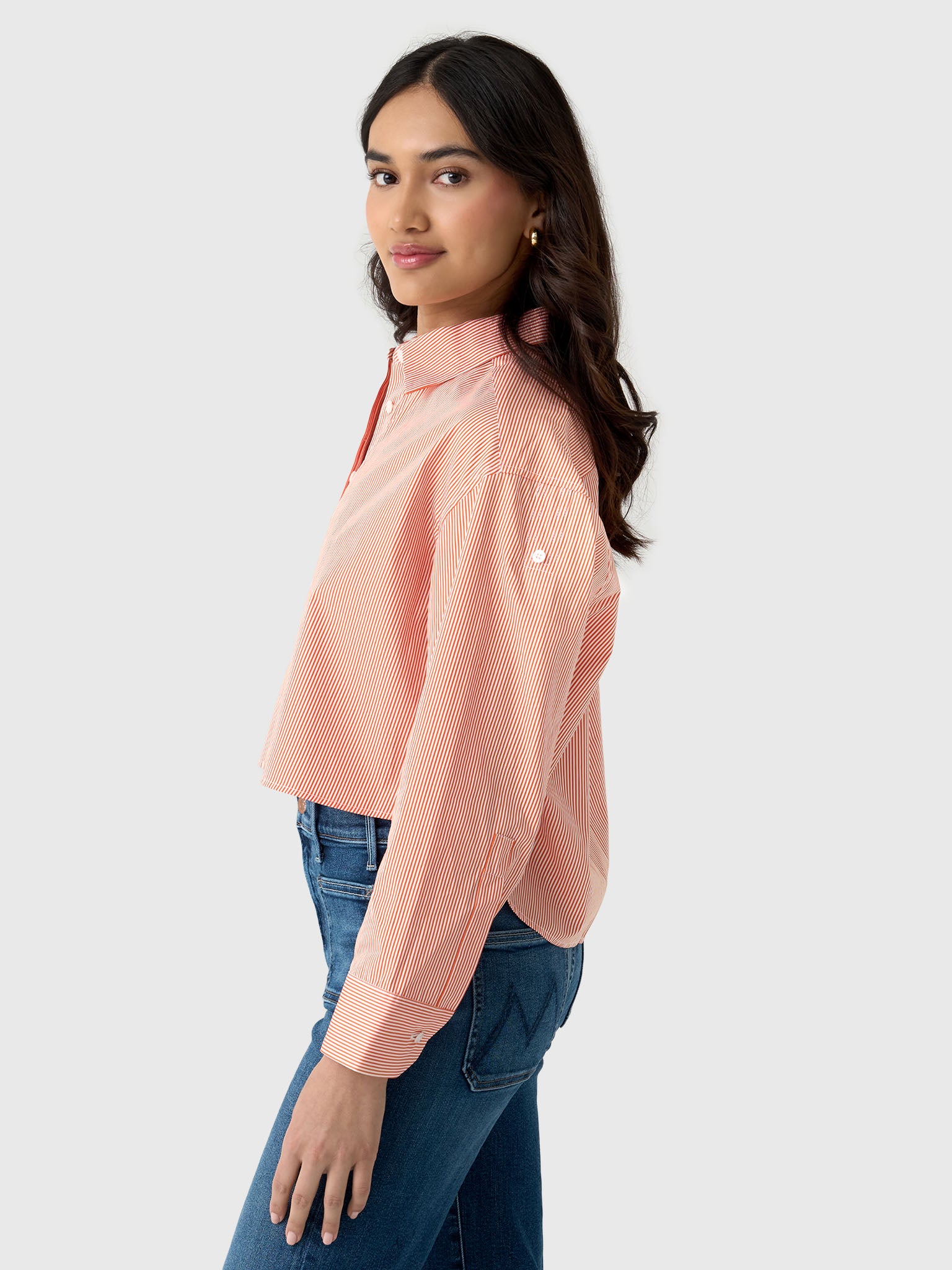 FEATURES:Point Collar Button Cuffs Hidden Button-Down Front Cropped Silhouette All-Over Stripe Print 100% Cotton Relaxed Fit Model is wearing size Small shirt. Model's Measurements: Height: 5'10.5" | Bust: 32A | Waist: 25" | Hips: 37" | Dress Size: 0-2 (US)