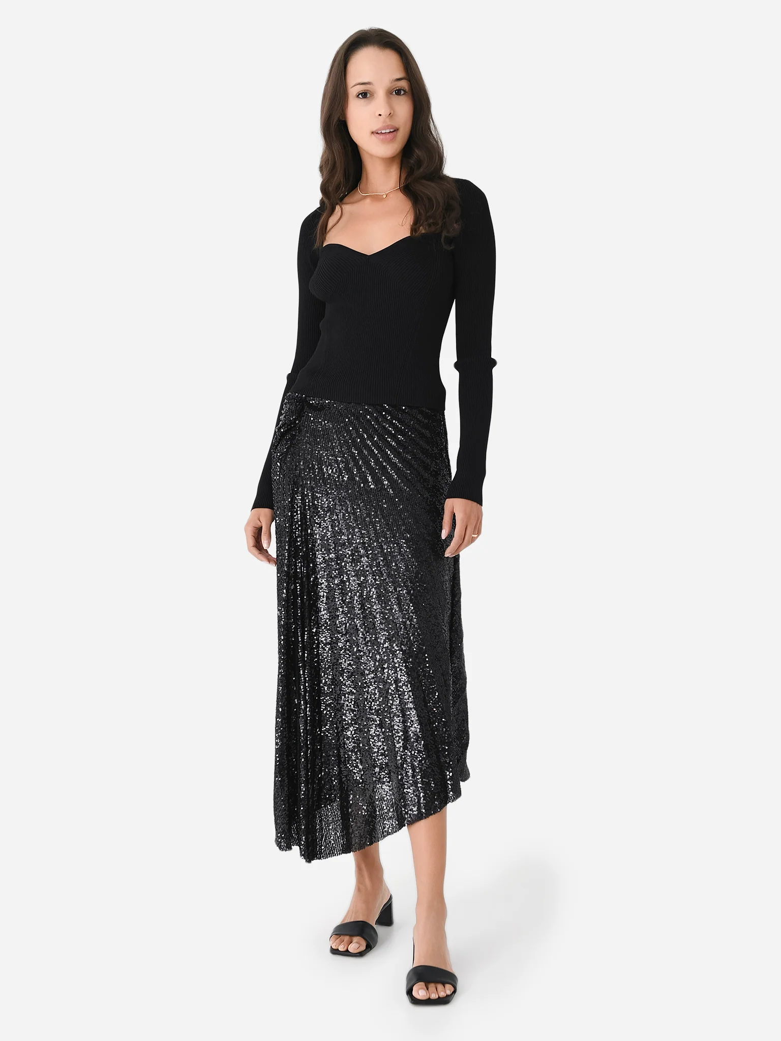 FEATURES:High Waisted Side Zip Closure Asymmetrical Hem Midi Silhouette Pleated Construction All-Over Sequin Fabrication 96% Polyester, 4% Elastane Classic Fit Model is wearing size 2 skirt. Model's Measurements: Height: 5'8" | Bust: 32C | Waist: 24" | Hips: 34" | Dress Size: 0-2 (US)