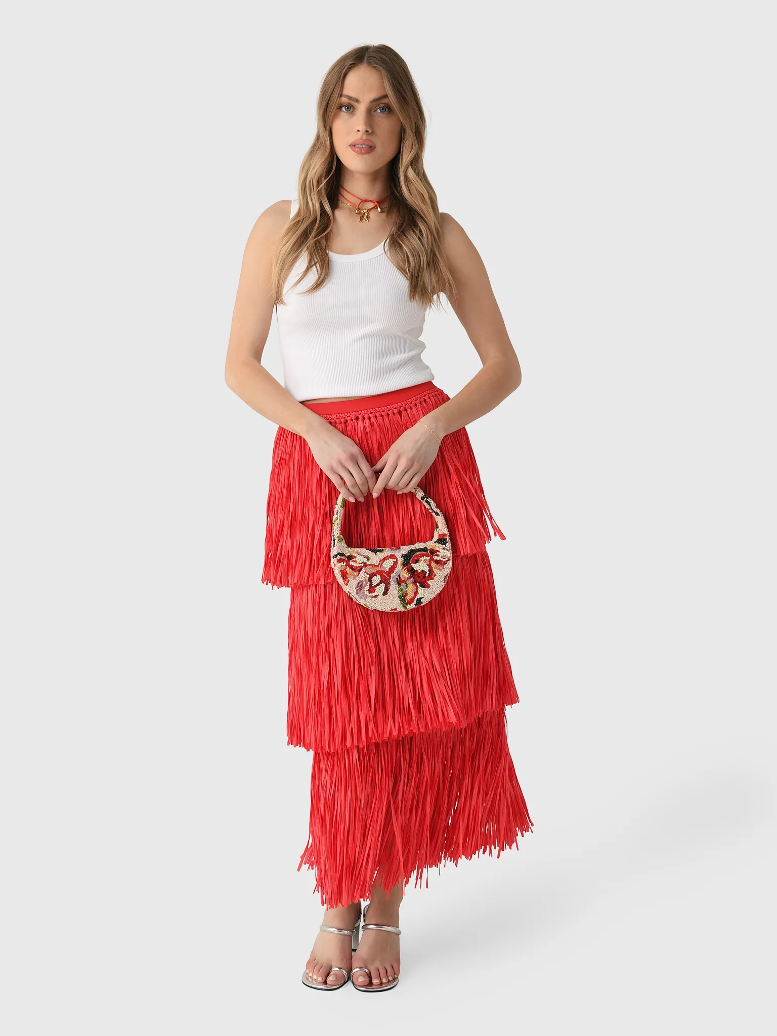 This bohemian-inspired maxi skirt is crafted with layered raffia that creates rich texture and fluid, eye-catching movement. Effortlessly statement-making, it brings an artisanal, free-spirited elegance to any look.