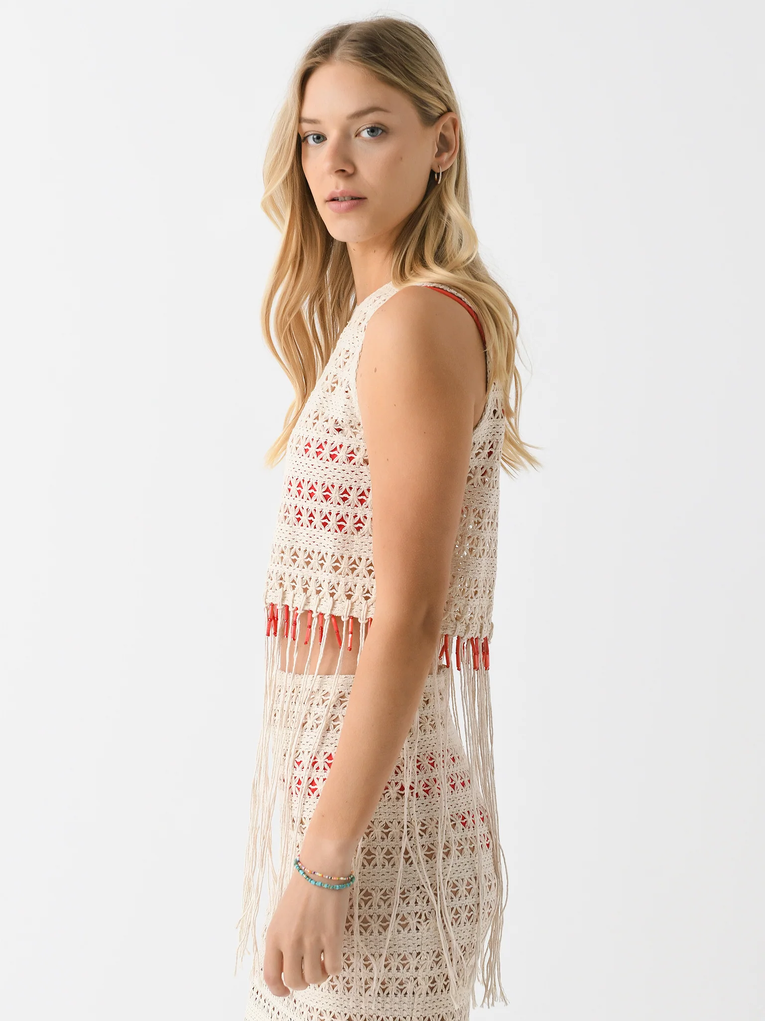 Sleeveless cropped top made from crochet cotton with a beaded fringe hem.