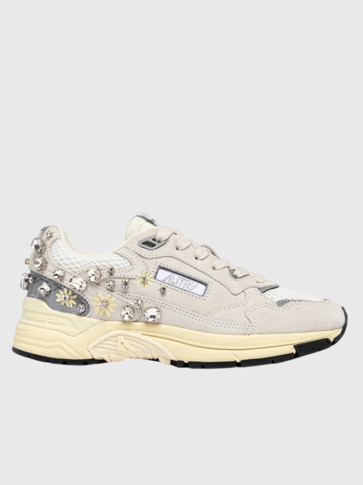 This innovative silhouette is engineered with advanced Action Cush technology to ensure maximum comfort and a smooth, effortless stride throughout the day. For a touch of contemporary flair, this edition is distinguished by intricate floral embroidery and shimmering rhonestone applications on the heel, giving the sneaker a truly unique and artisanal character.