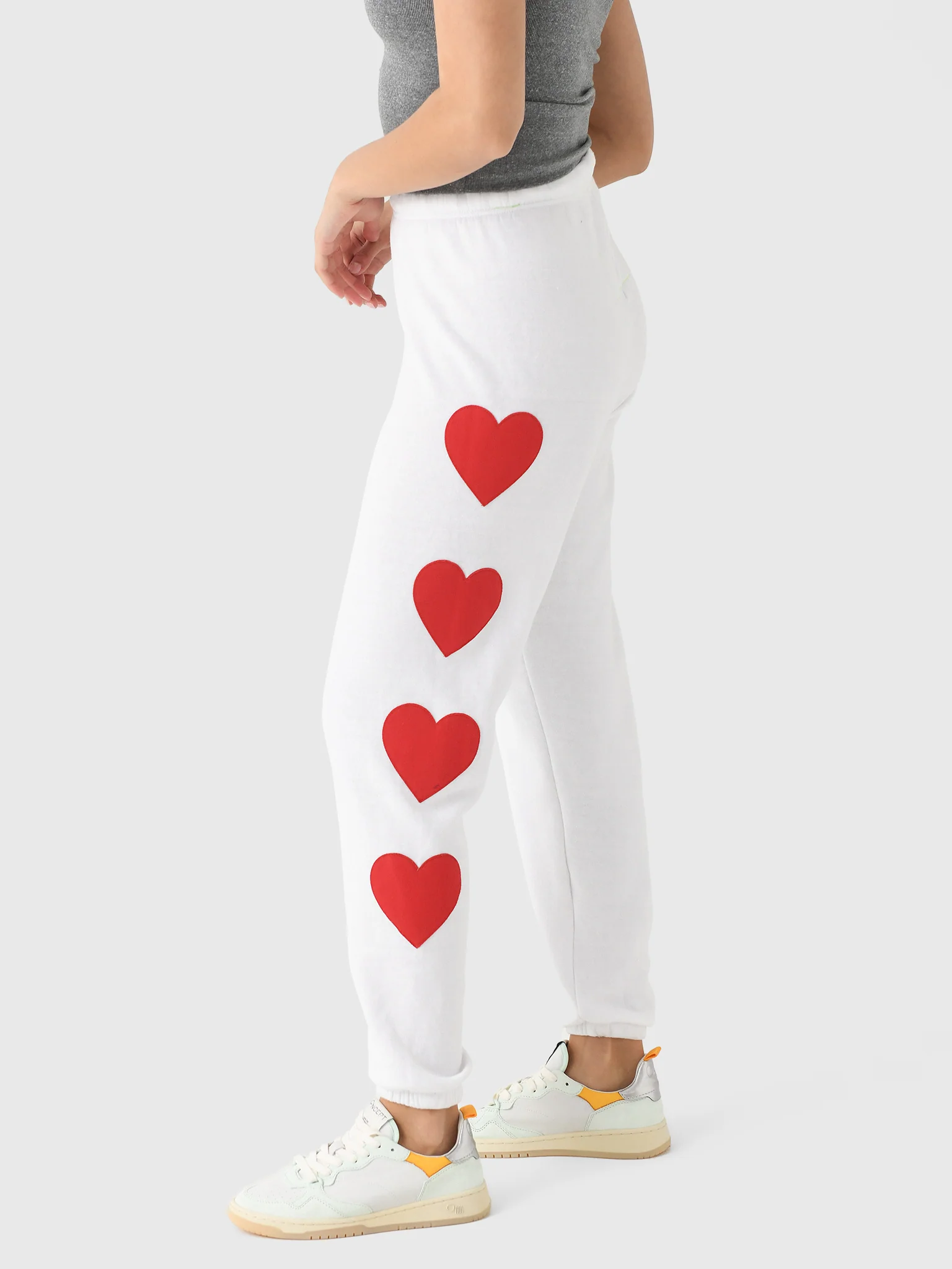 This ultra-soft sweatpant is made from tri-blend fleece and features stitched heart graphics.