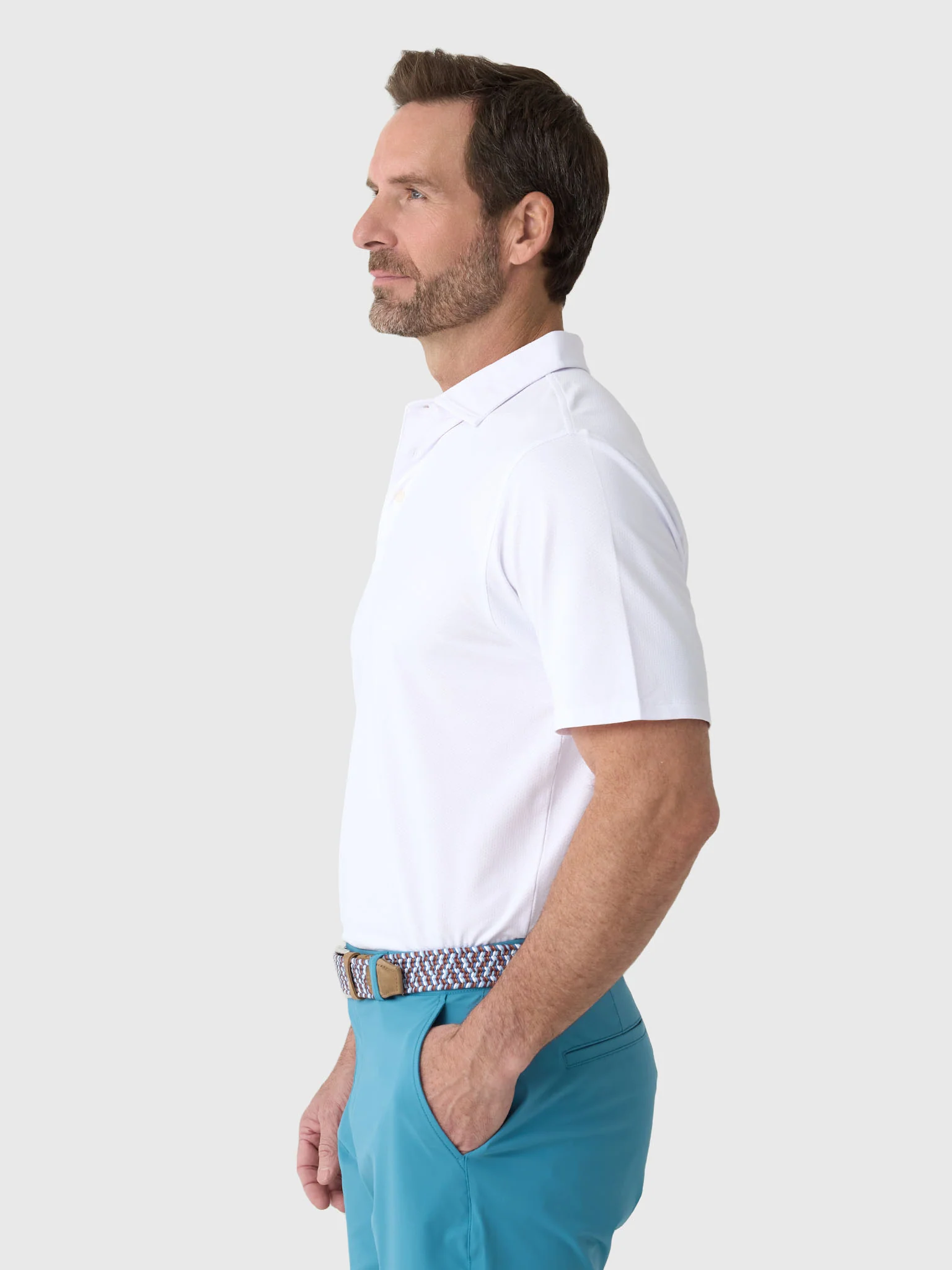 This polo is a versatile staple crafted from innovative cooling fabric. Designed with a light-as-air feel and a textured surface for superior breathability, it keeps you feeling fresh and looking sharp from the first tee to the 19th hole.