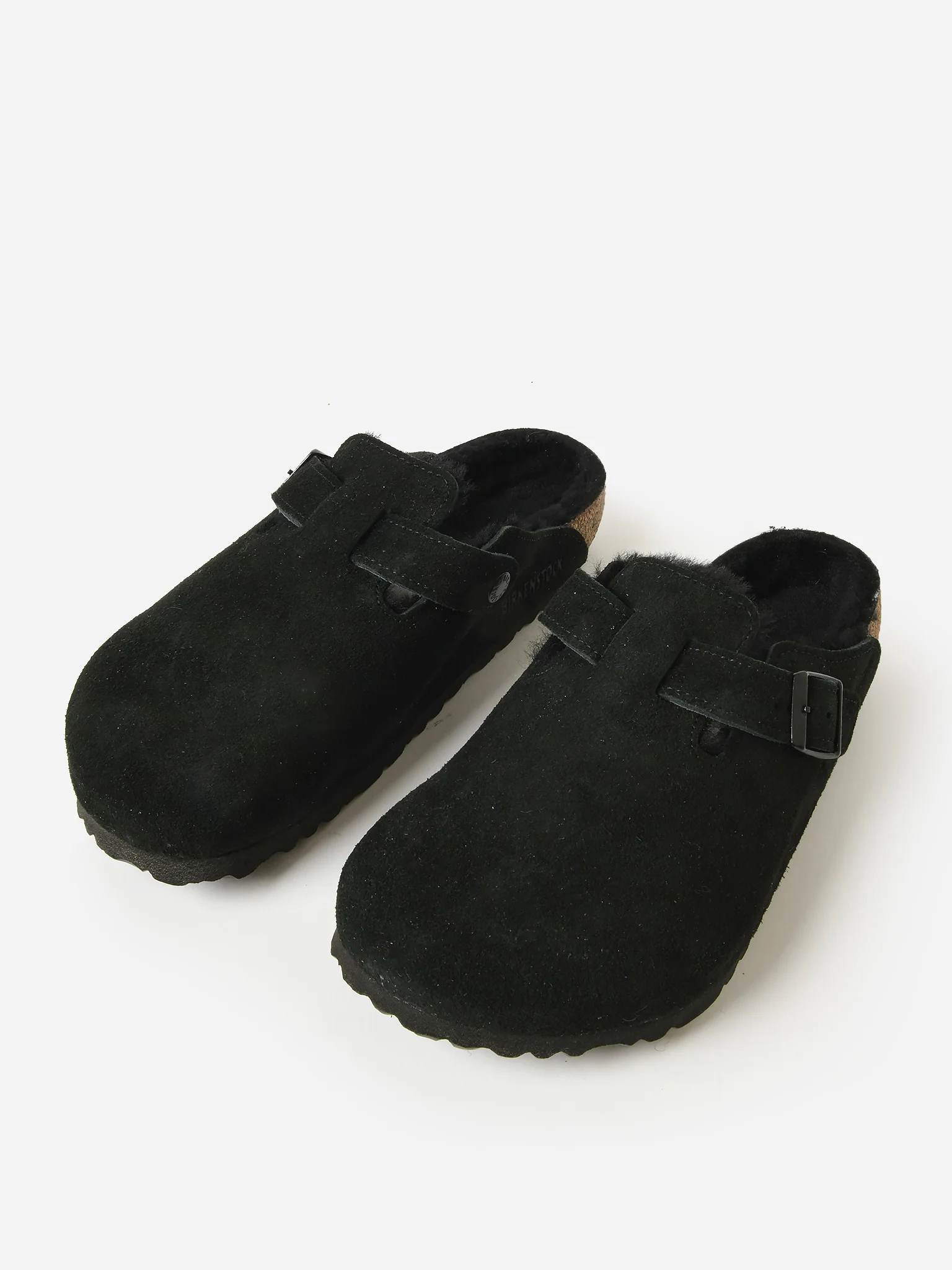 FEATURES:Adjustable Buckle Round Toe Anatomically Shaped Footbed Upper: Suede Lining: Shearling Footbed: Cork Sole: EVA Narrow Fit