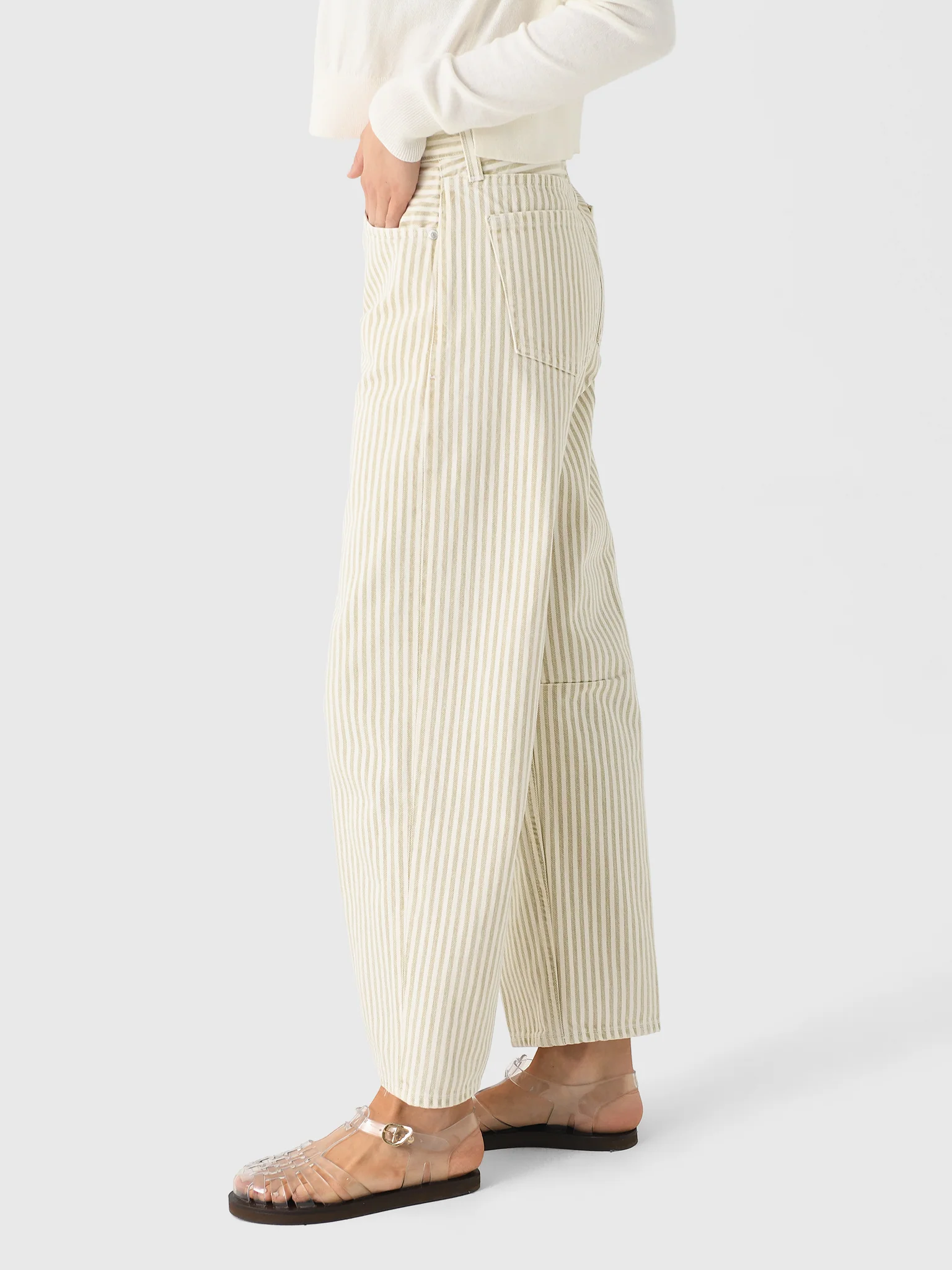 This modern barrel-leg design offers a versatile silhouette. The relaxed fit through the hips and tapered leg opening provides a flattering look that can be dressed up or down.