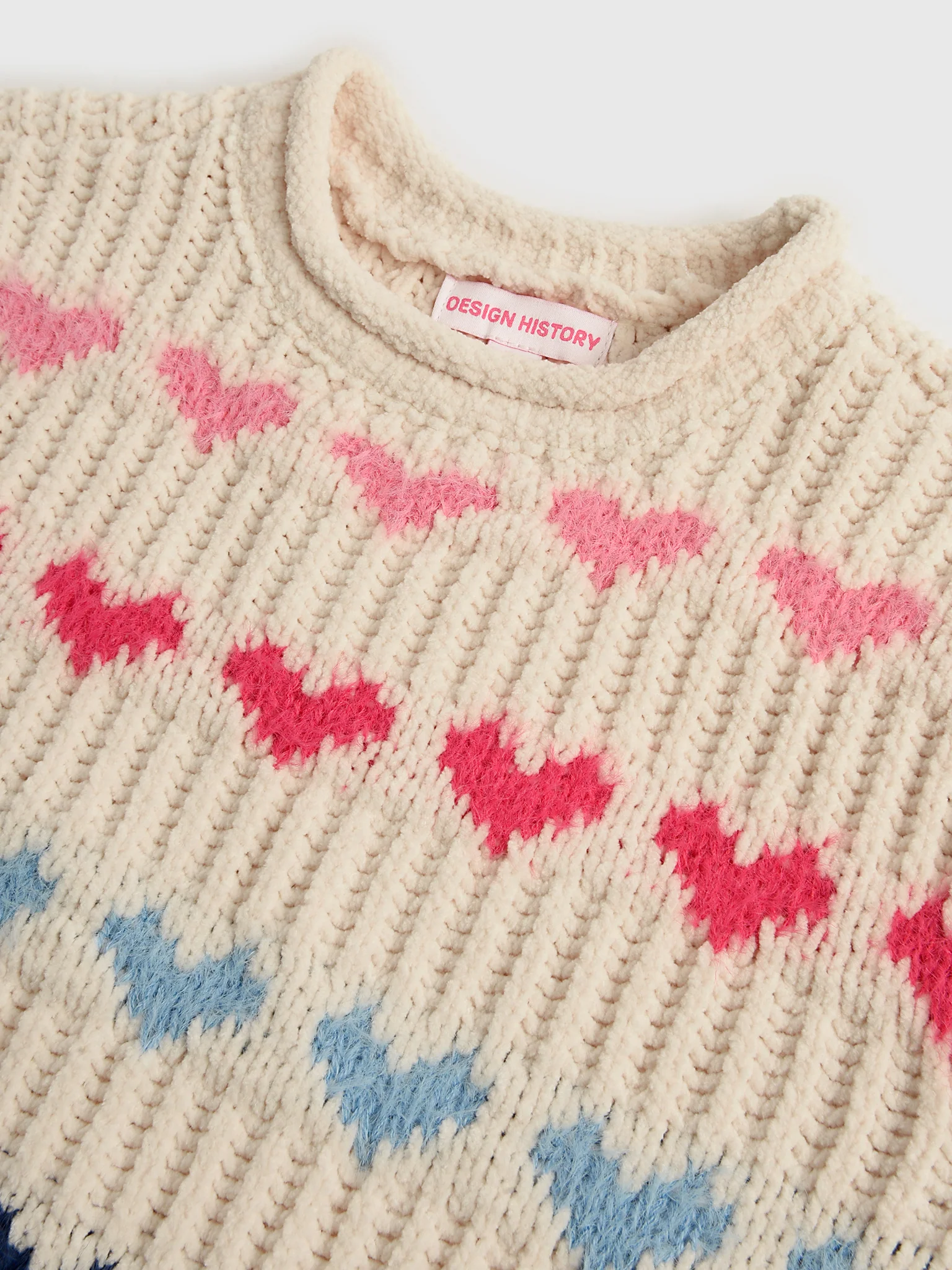Made from cozy knit yarn, this charming crewneck sweater features a rolled neckline, ribbed trims, and a playful multi-colored heart pattern. It's the perfect blend of comfort and cuteness for chilly days.