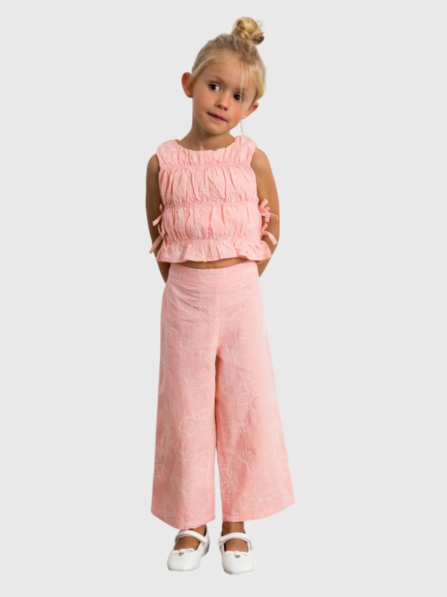 FEATURES:Round Neckline Sleeveless Ruched Design Self-Tie Sides Matching Pant Wide Leg Silhouette Eyelet Embroidered Fabric 100% Cotton Classic Fit