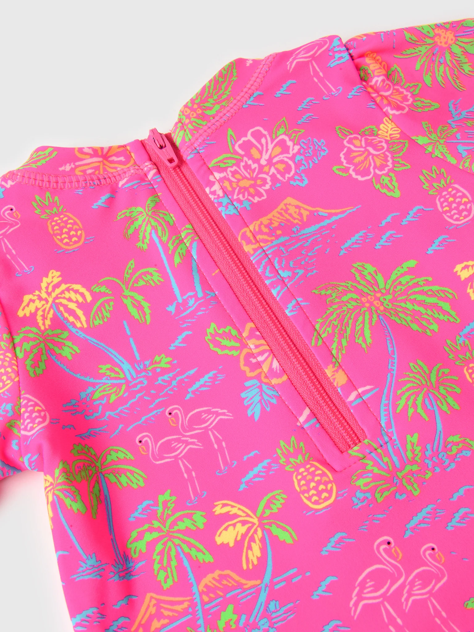 This adorable rashguard swimsuit is perfect for fun in the sun! The vibrant pink design features a playful tropical scene with palm trees, flamingos, and pineapples, adding a touch of island charm to her swim adventures.