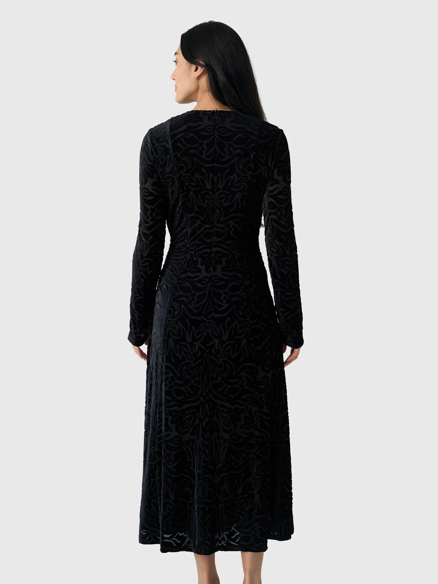 Crafted from stunning floral-patterned burnout velvet, the Julie long-sleeve dress offers beautiful texture and drape. The fluid midi silhouette and deep V-neckline create a flattering, elegant, and alluring style.