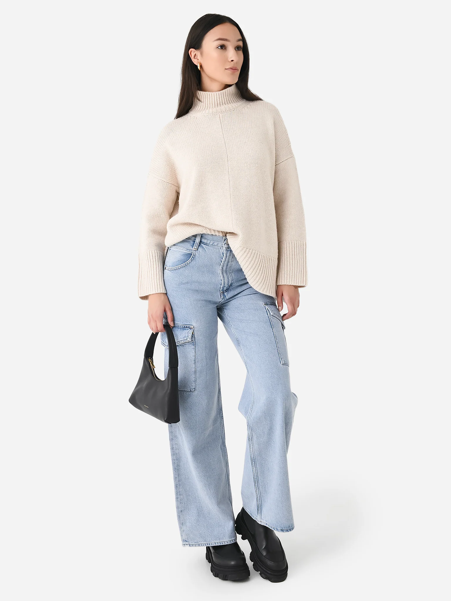 FEATURES:Turtleneck Dropped Shoulder Split Hem Ribbed Neckline, Cuffs and Hem Knit Fabrication 90% Wool, 10% Cashmere Relaxed Fit Model is wearing size XS/S sweater. Model's Measurements: Height: 5'9" | Bust: 32B | Waist: 24" | Hips: 36" | Dress Size: 2 (US)
