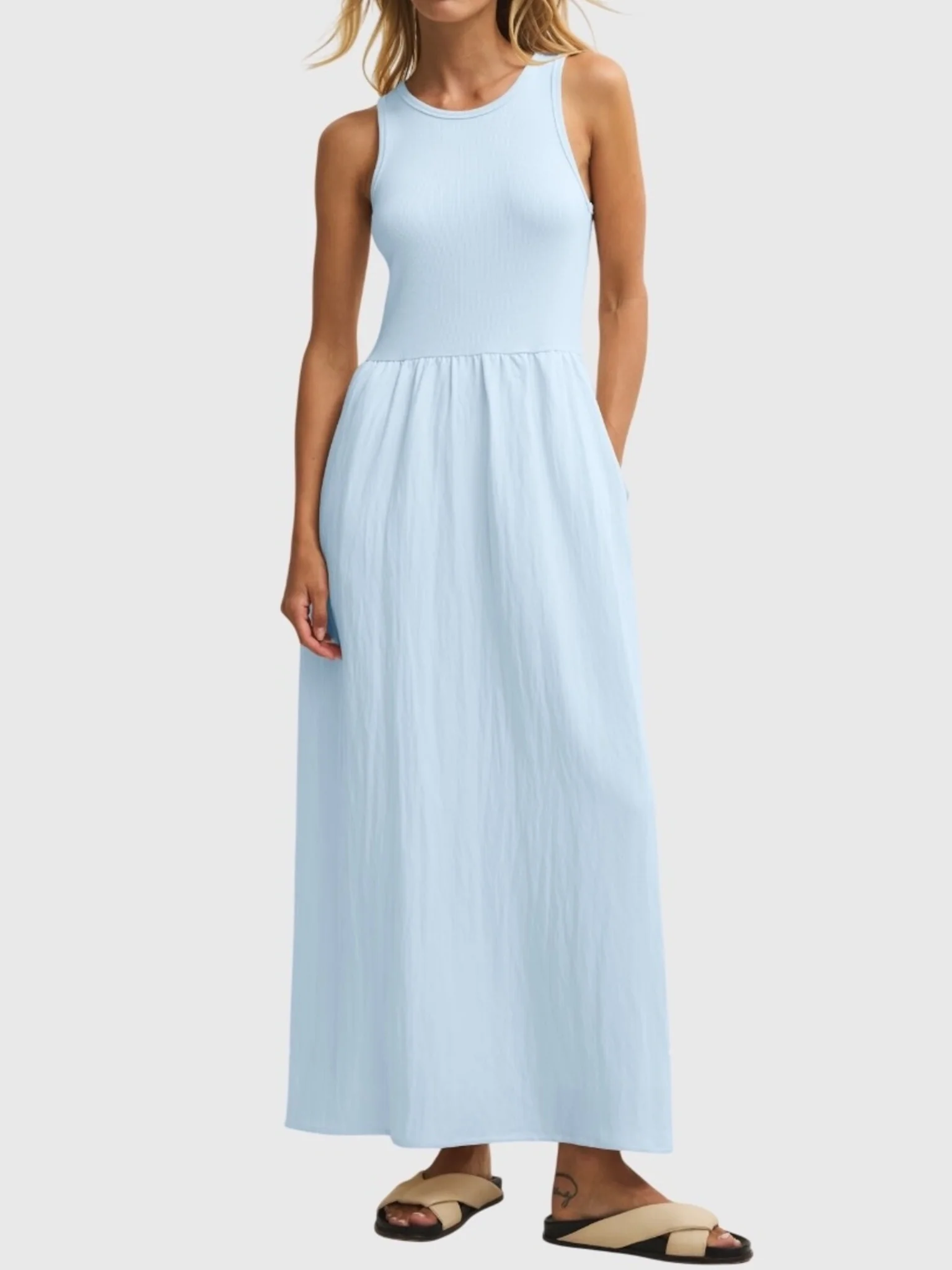 A mid-length combo dress made with a ribbed bodice and a lightweight and flowy skirt.