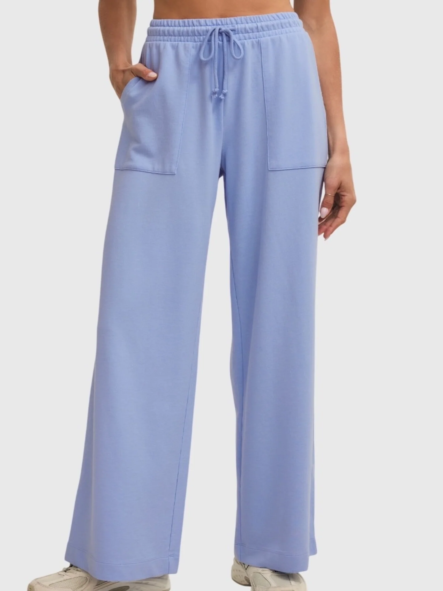 This high-waisted pant combines the breezy feel of a wide-leg cut with the comfort of lightweight French terry fabric. Featuring a vintage-inspired burnout wash and essential side pockets, it's designed for looking good while staying cozy.